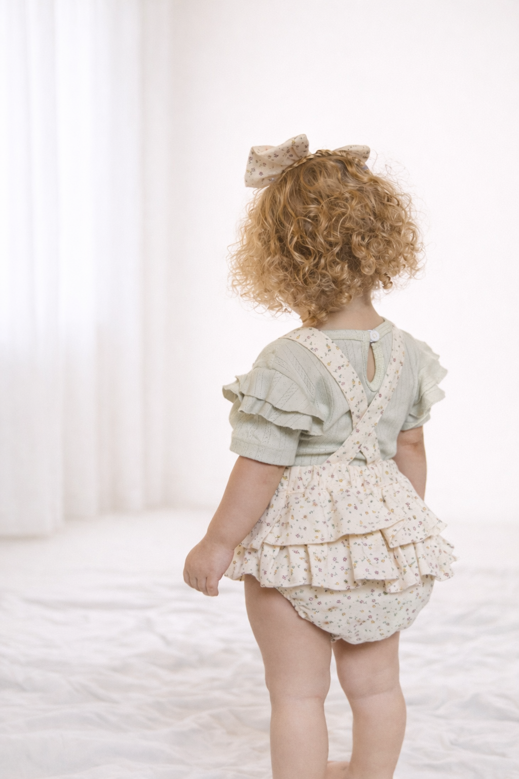 Conjunto perfecto para los días soleados. Body tipo braguita adornado con delicadas florecitas y detalles en gotitas en la parte trasera, combinado con camiseta 100% algodón de textura suave y delicada. Diseño tierno y cómodo que cuida la piel sensible de tu bebé, permitiendo libertad de movimiento. Ideal para disfrutar de la brisa y el sol con estilo.