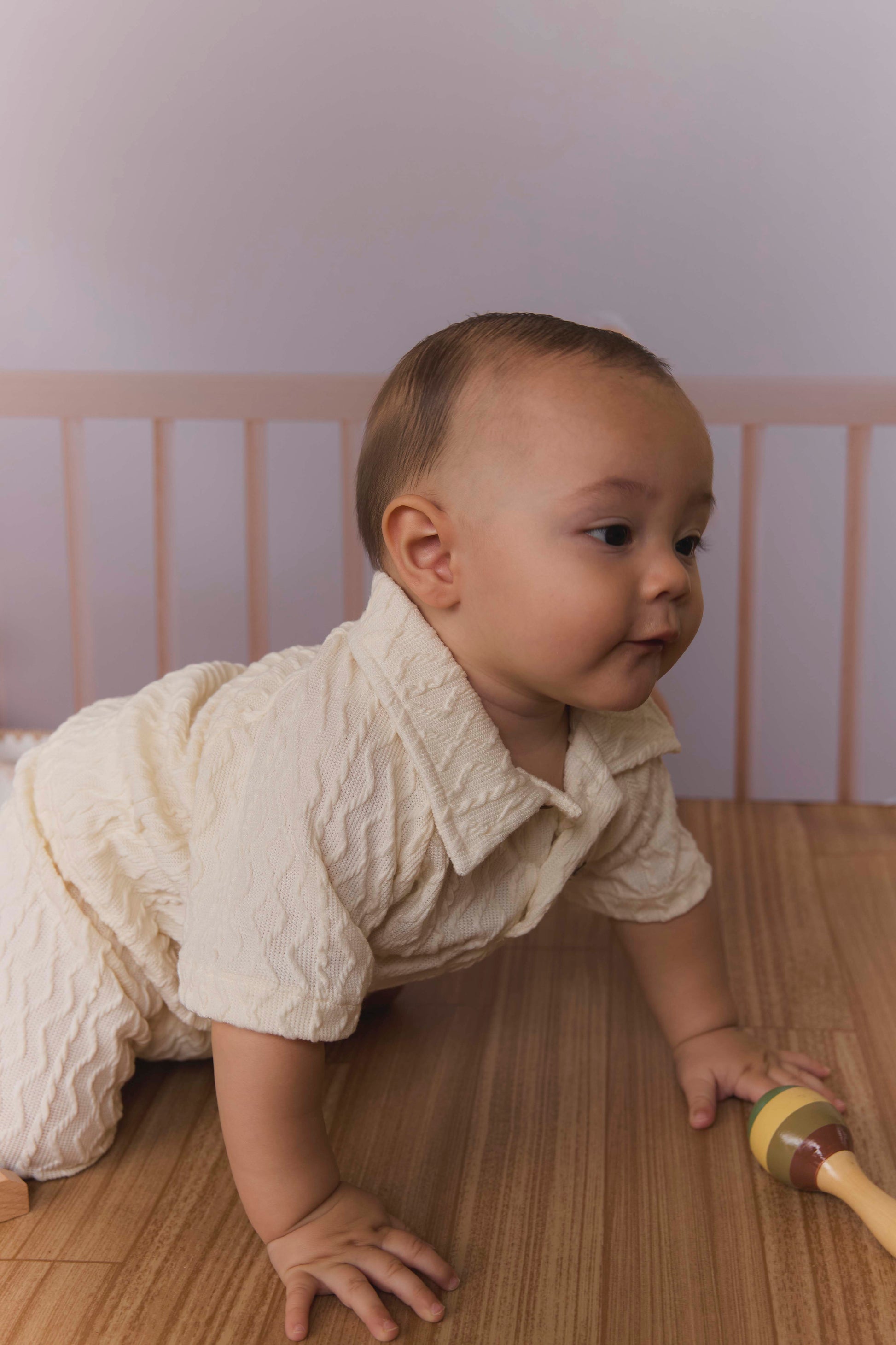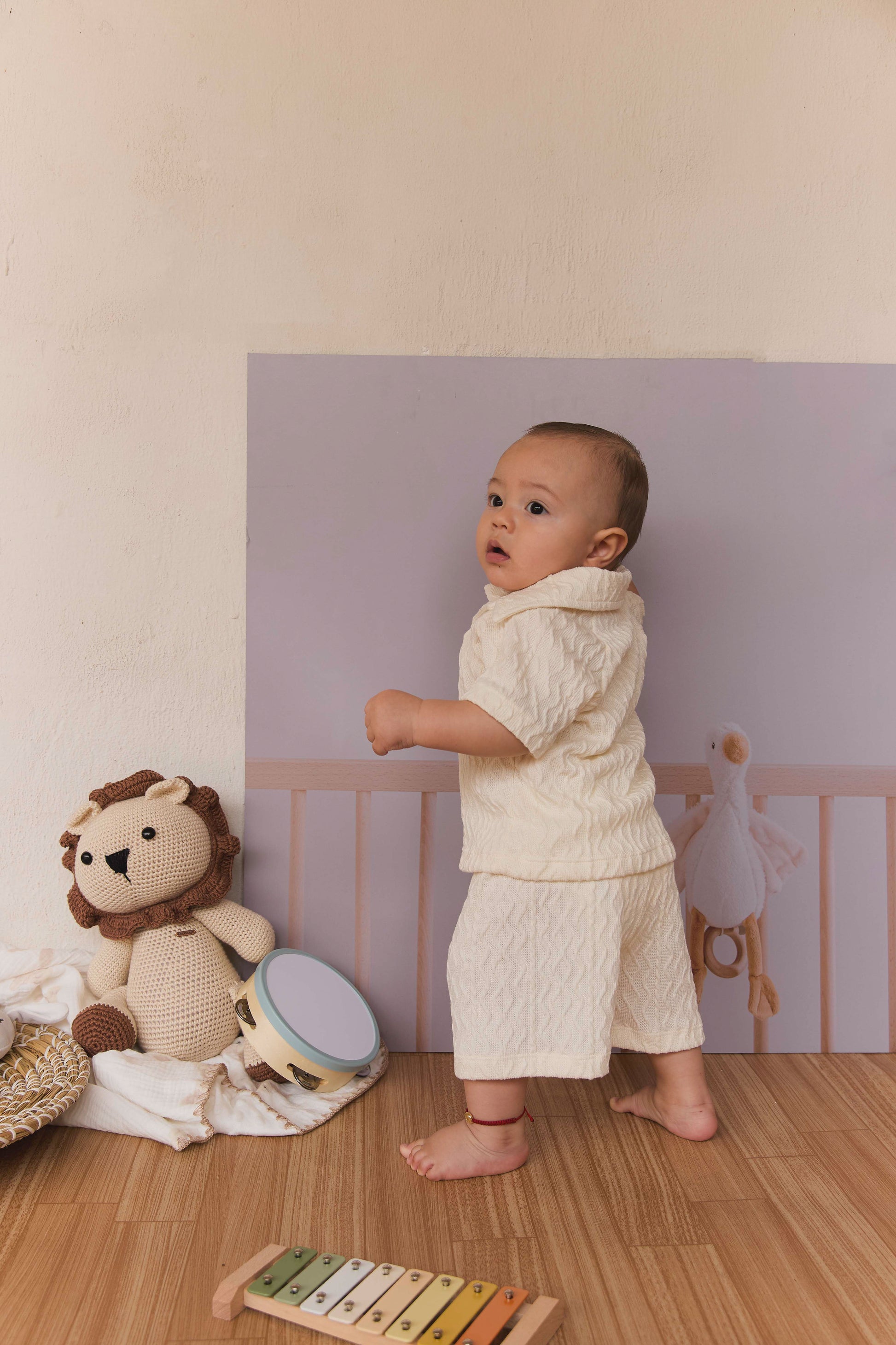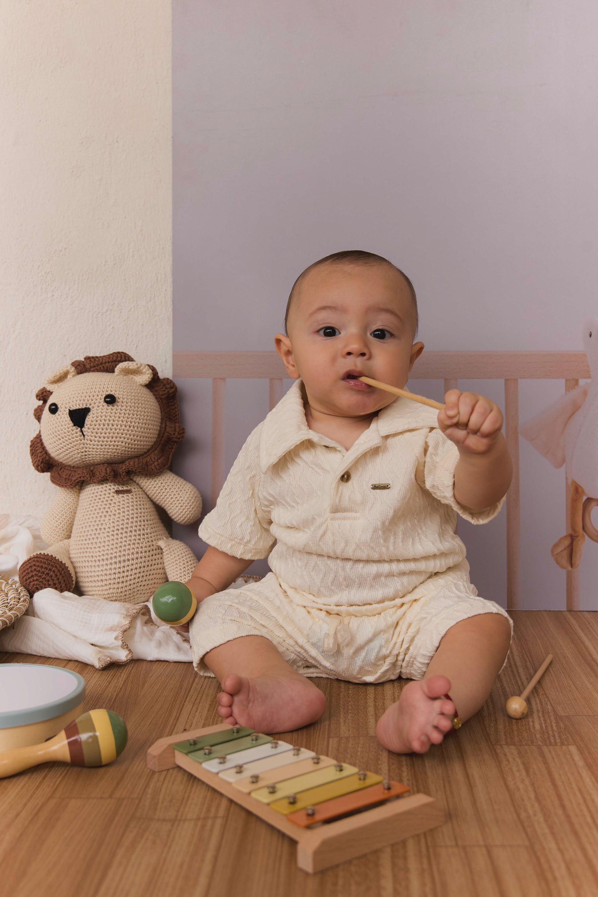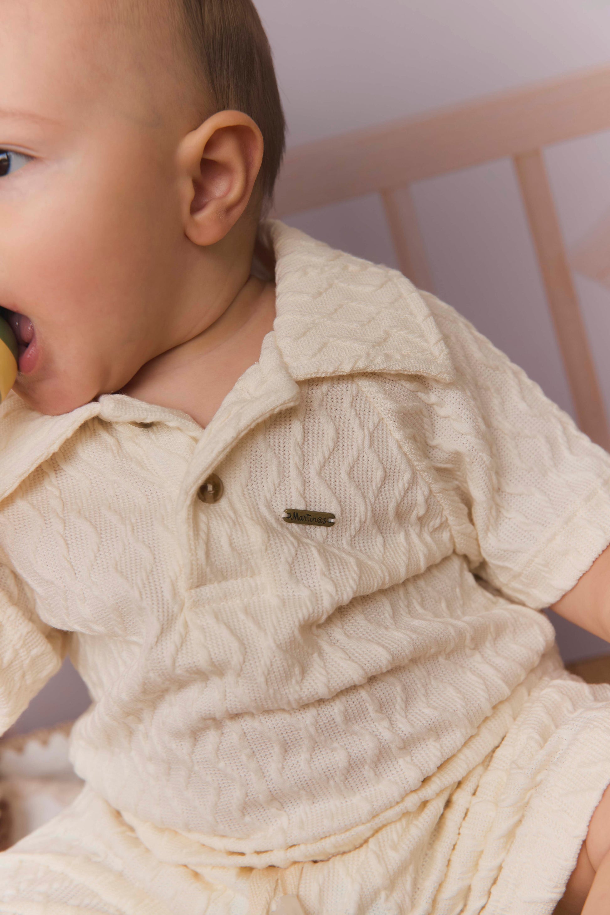 Este conjunto tejido de dos piezas, compuesto por pantalón y camisa tipo polo, ofrece comodidad y estilo en cada uso. Su diseño suave y delicado hace que sea perfecto para los momentos especiales y el día a día, brindando ternura y frescura en una sola prenda. Ideal para quienes buscan un toque dulce y acogedor en su vestuario.