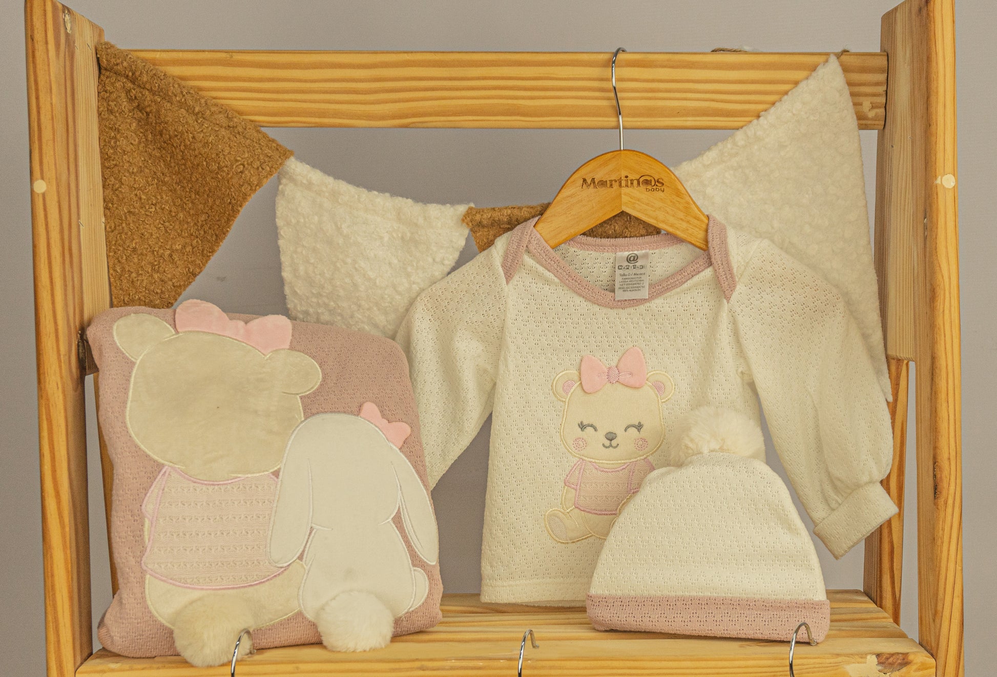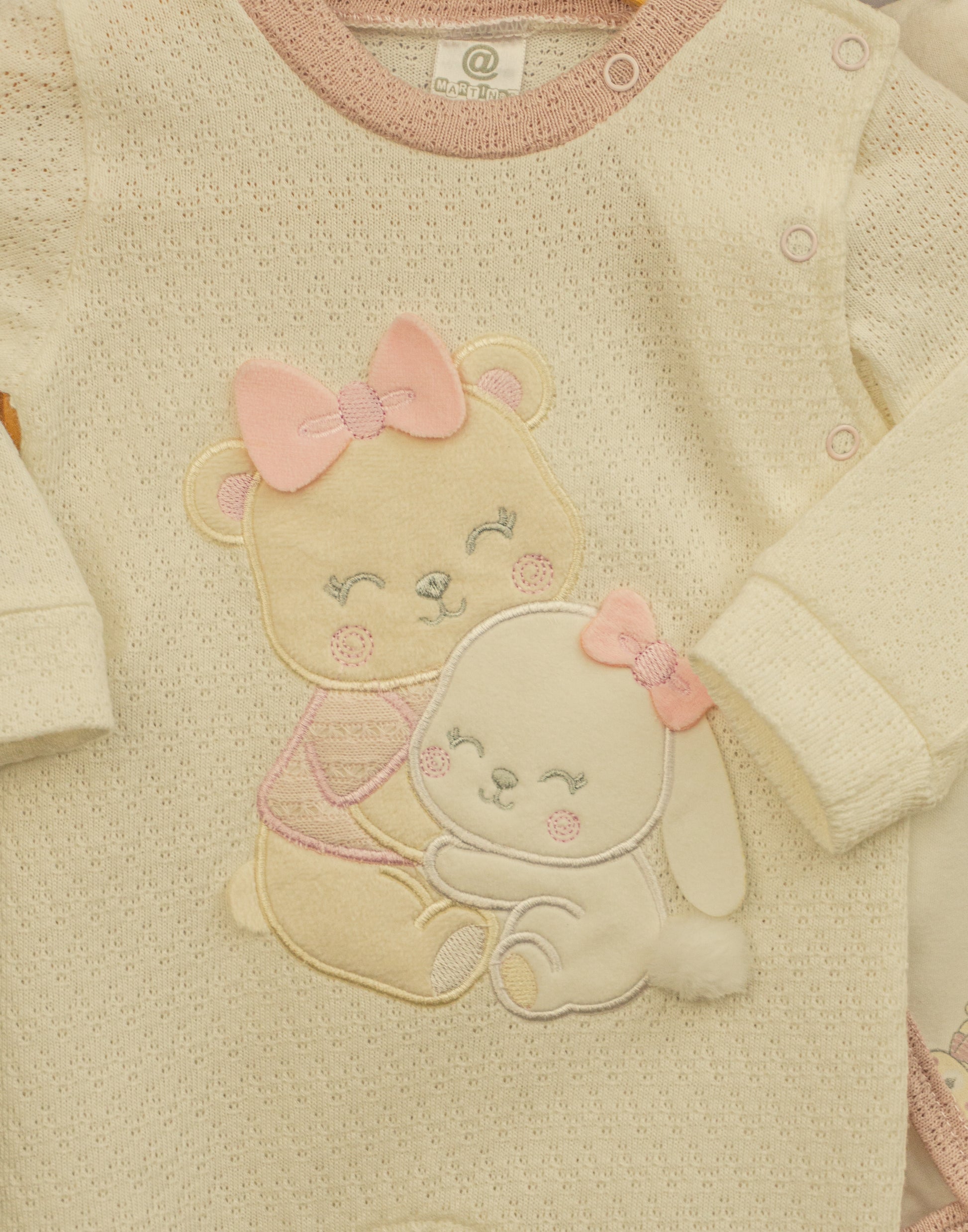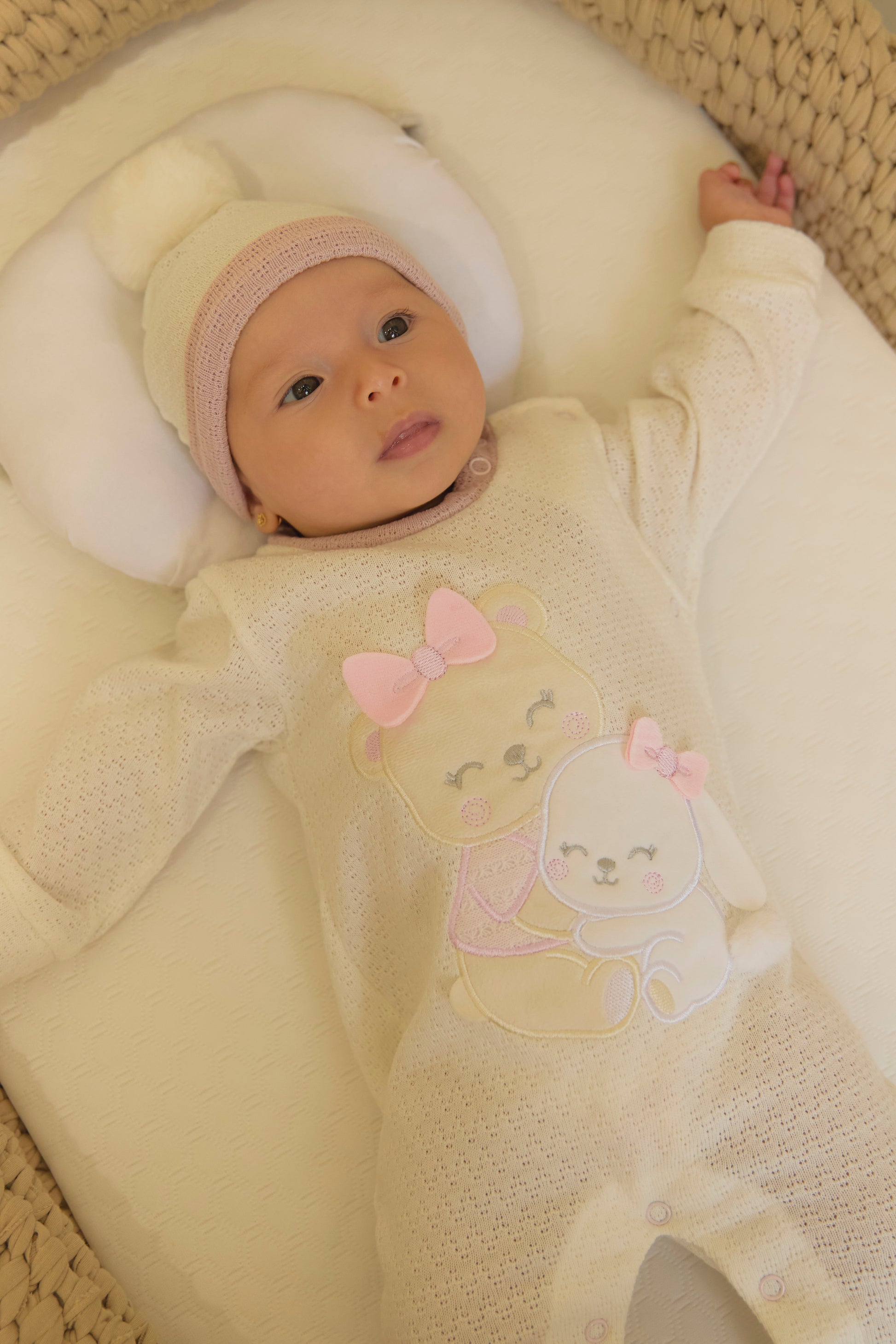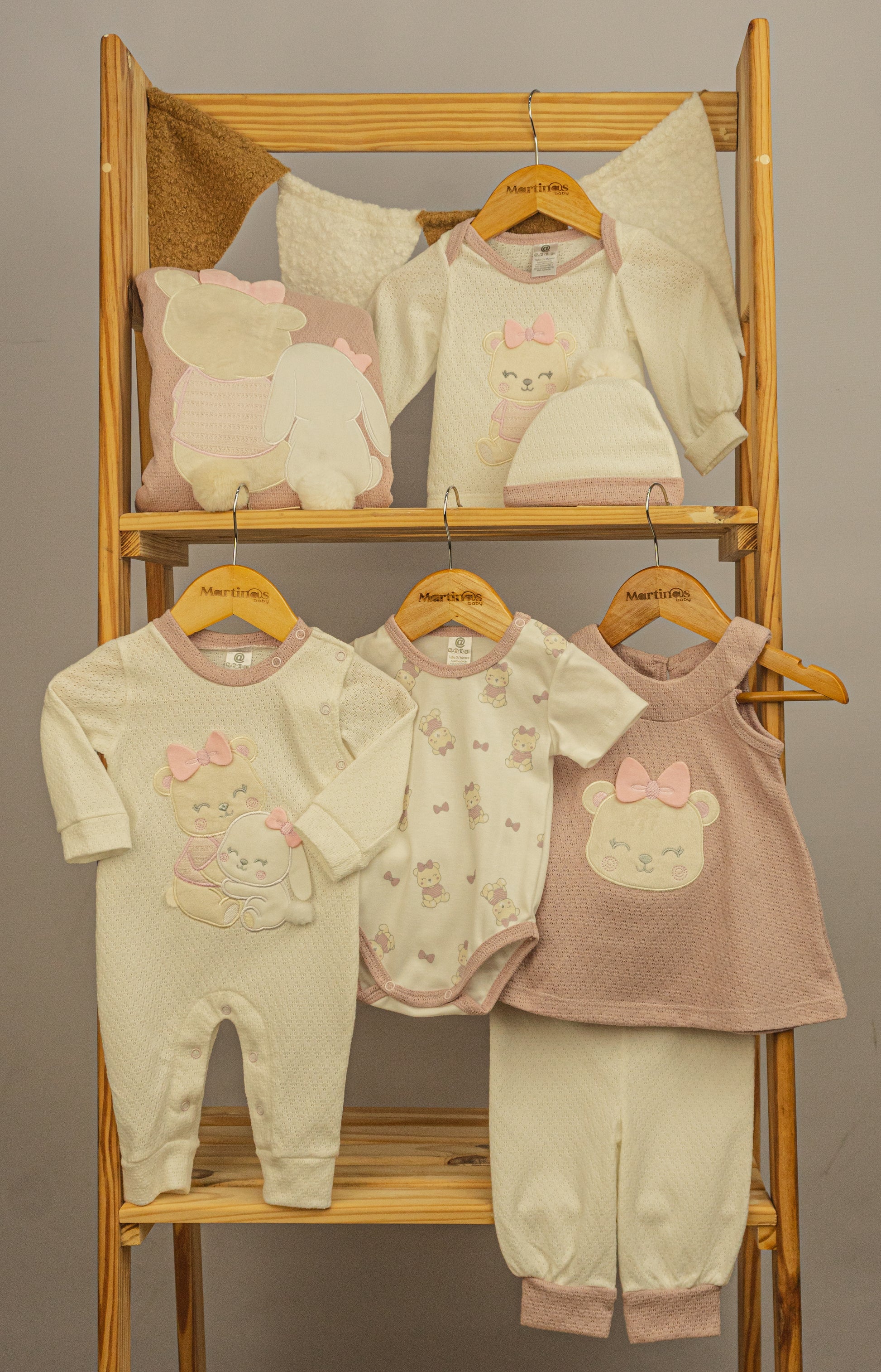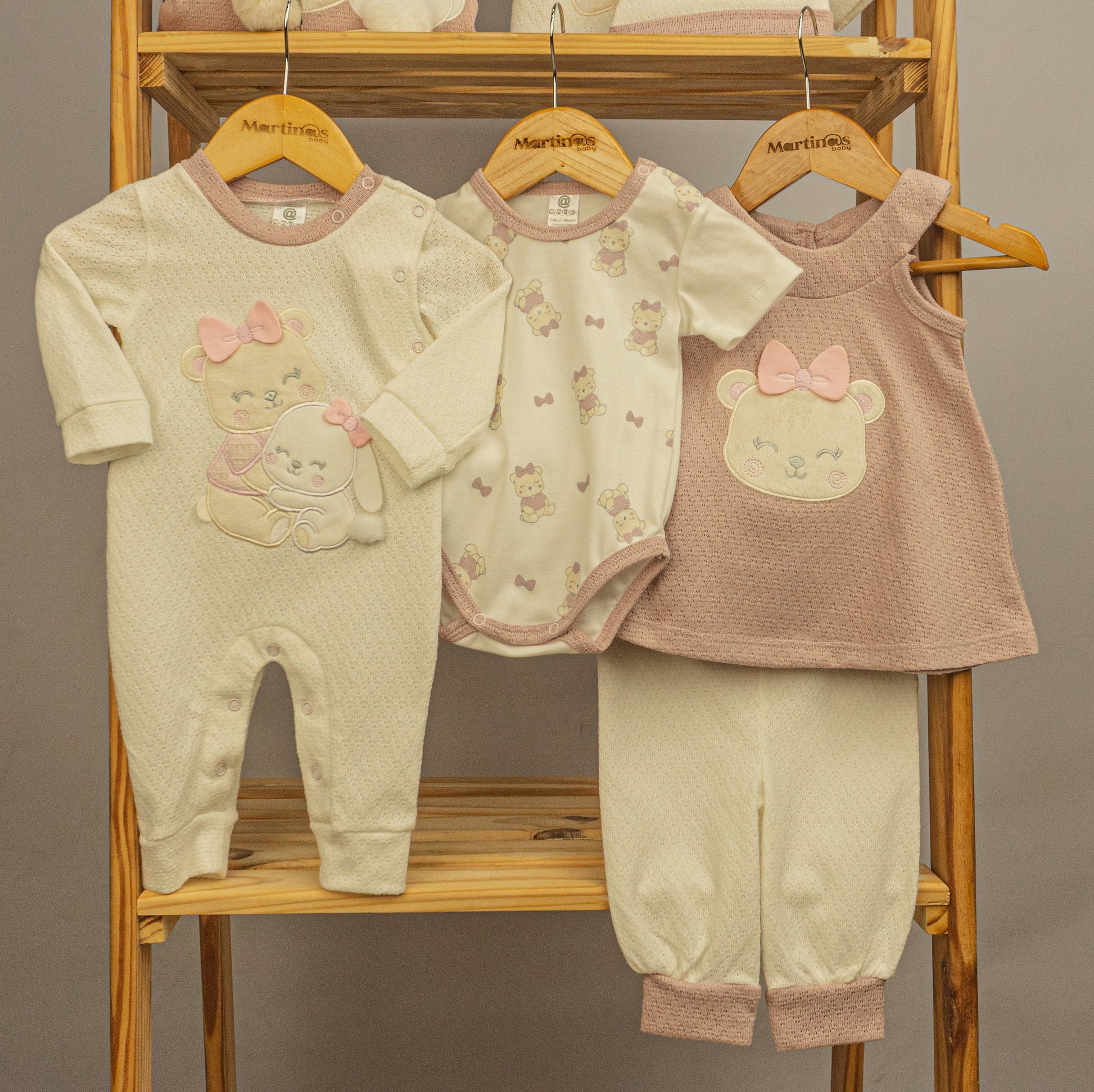Nuestro set "Primer Día Cony" está diseñado en algodón de textura suave y transpirable, pensando exclusivamente en la delicadeza de la piel de tu bebé. Este completo conjunto de 9 piezas en tonos crema y rosa viejo incluye: pantaloncito, buso, pijama, body, camiseta, asoleador, gorrito, babero y cobija.