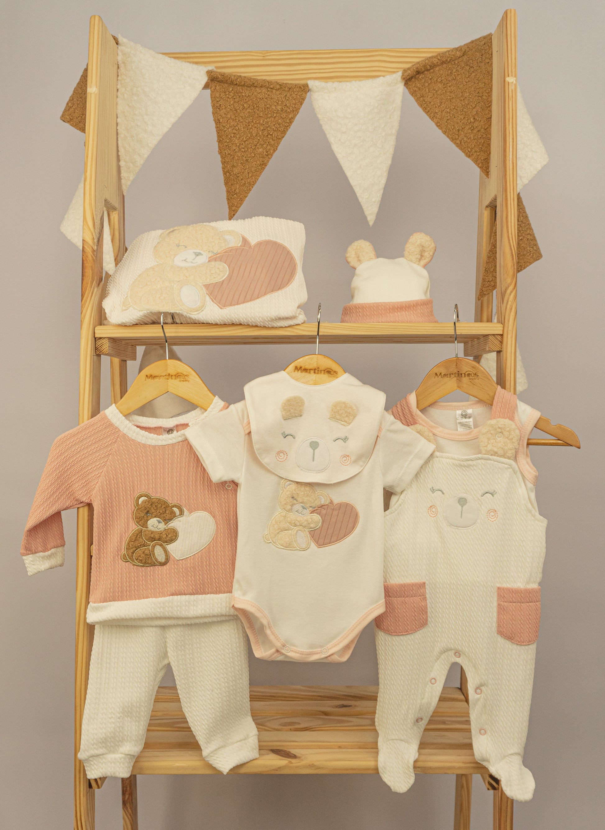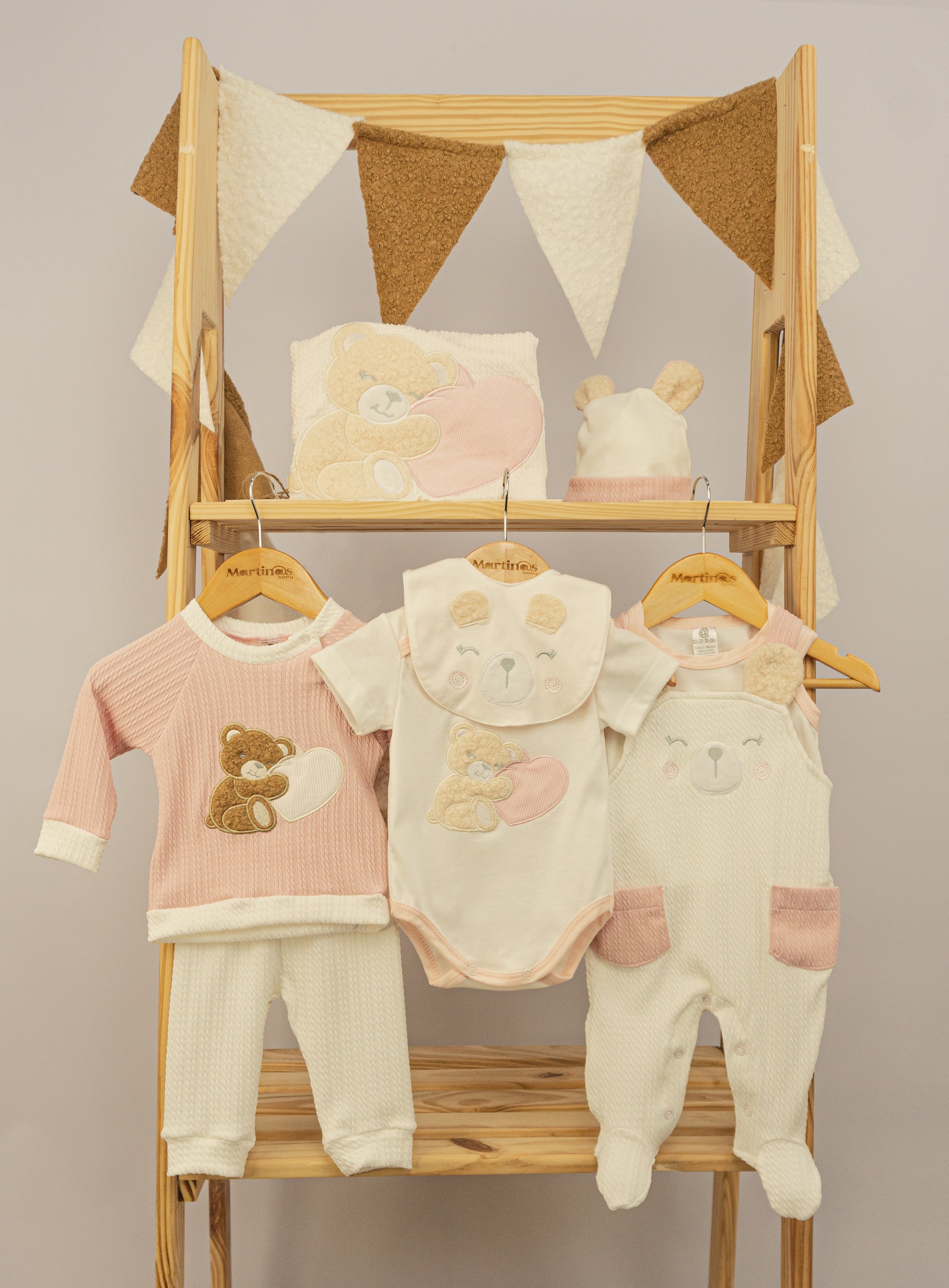 Recibe a tu bebé con amor y estilo con nuestro set Primer Día Love Star. Este hermoso conjunto de 7 piezas bordadas está confeccionado en algodón 100% puro, suave y delicado para la piel sensible de tu recién nacido. Incluye babero, gorro, buzo, pantalón, body, camisilla, enterizo y cobija, todo lo que necesitas para los primeros momentos especiales.