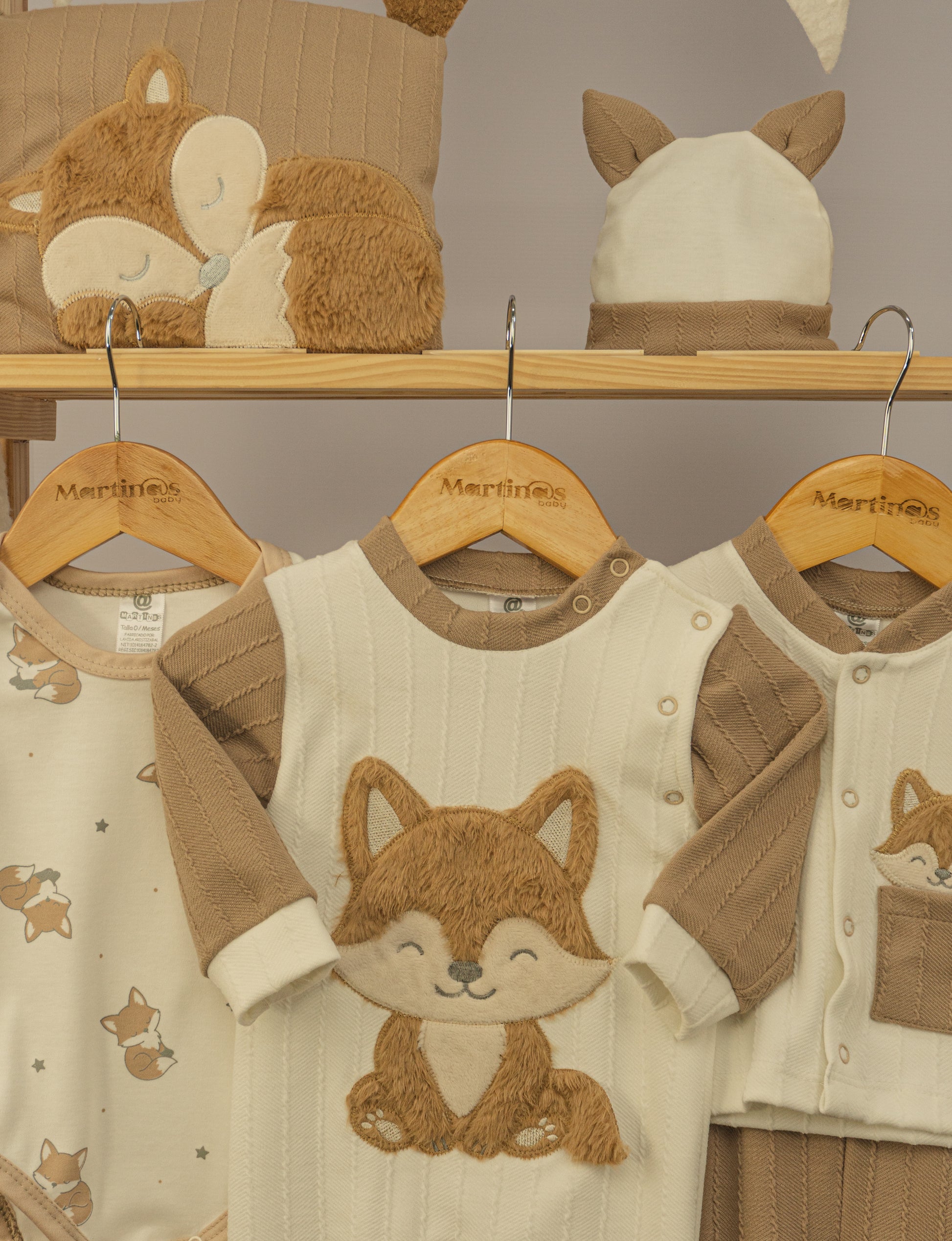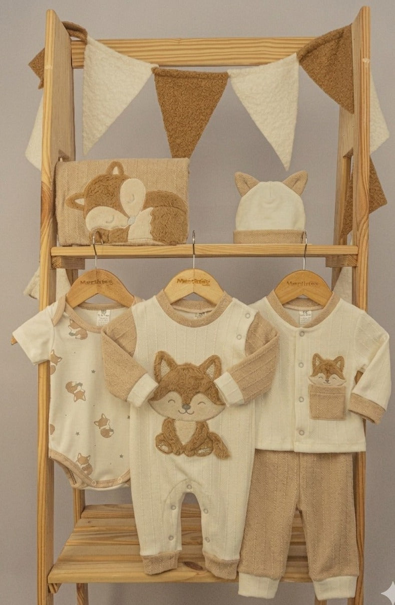 Conjunto completo "Primer Día Zorrito" en algodón suave y delicado, perfecto para la piel sensible de tu bebé. Incluye 9 piezas esenciales: pantaloncito, buso, pijama, body, camiseta, asoleador, gorrito, babero y cobija. Cada prenda presenta un bordado adorable de zorrito que añade calidez y ternura al guardarropa de recién nacido. Diseñado para comodidad máxima durante los primeros días especiales de tu pequeño.
