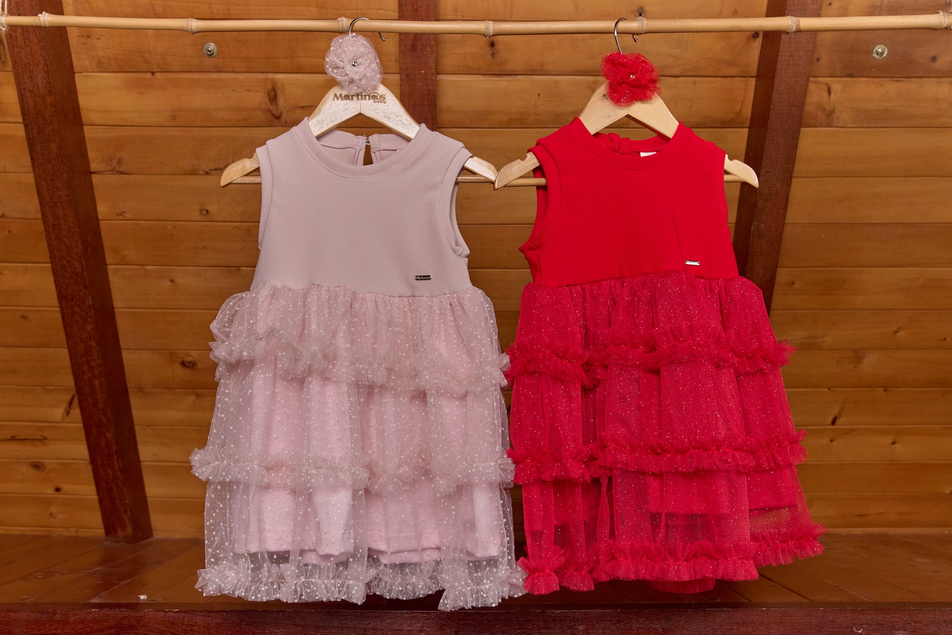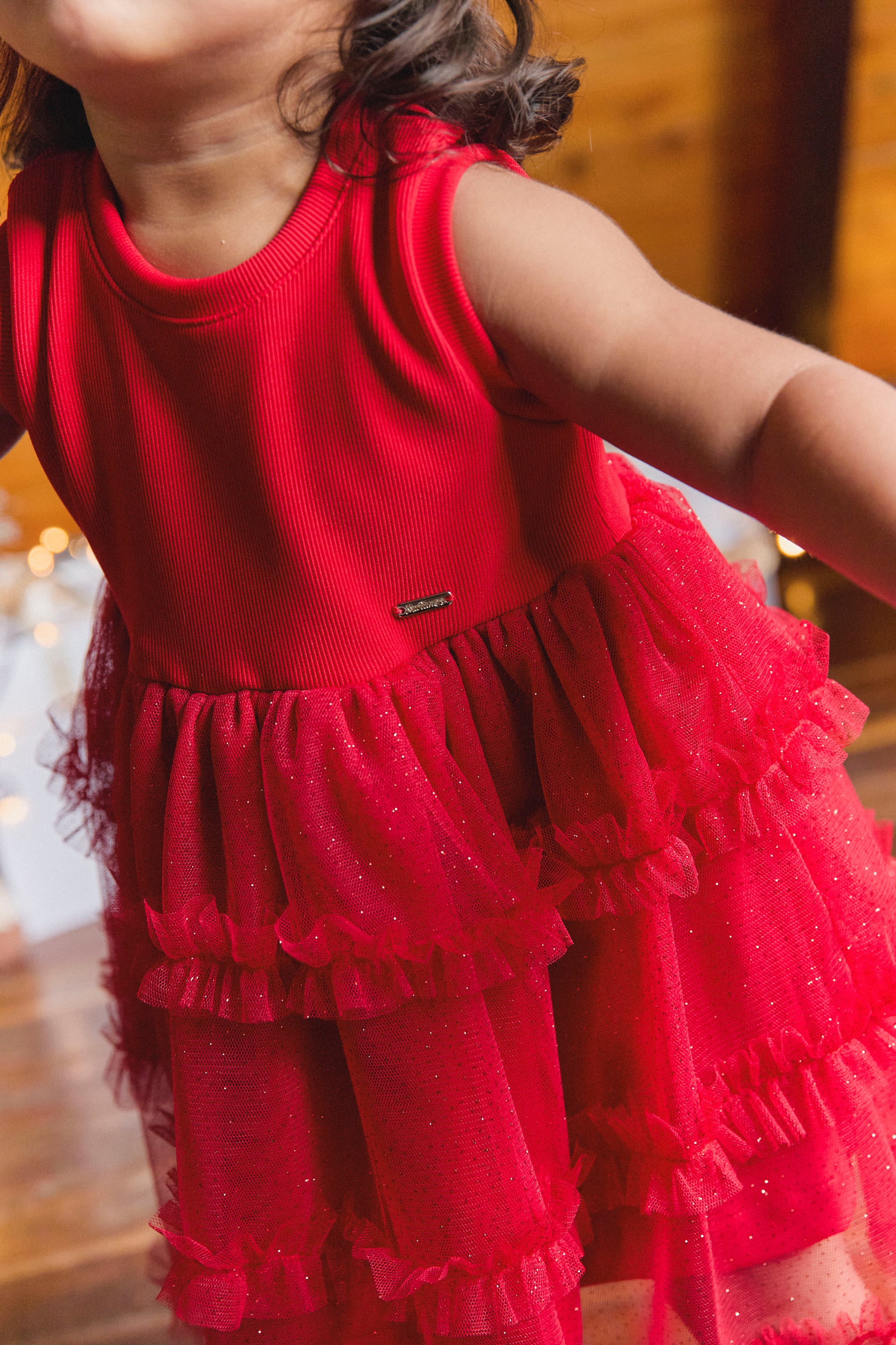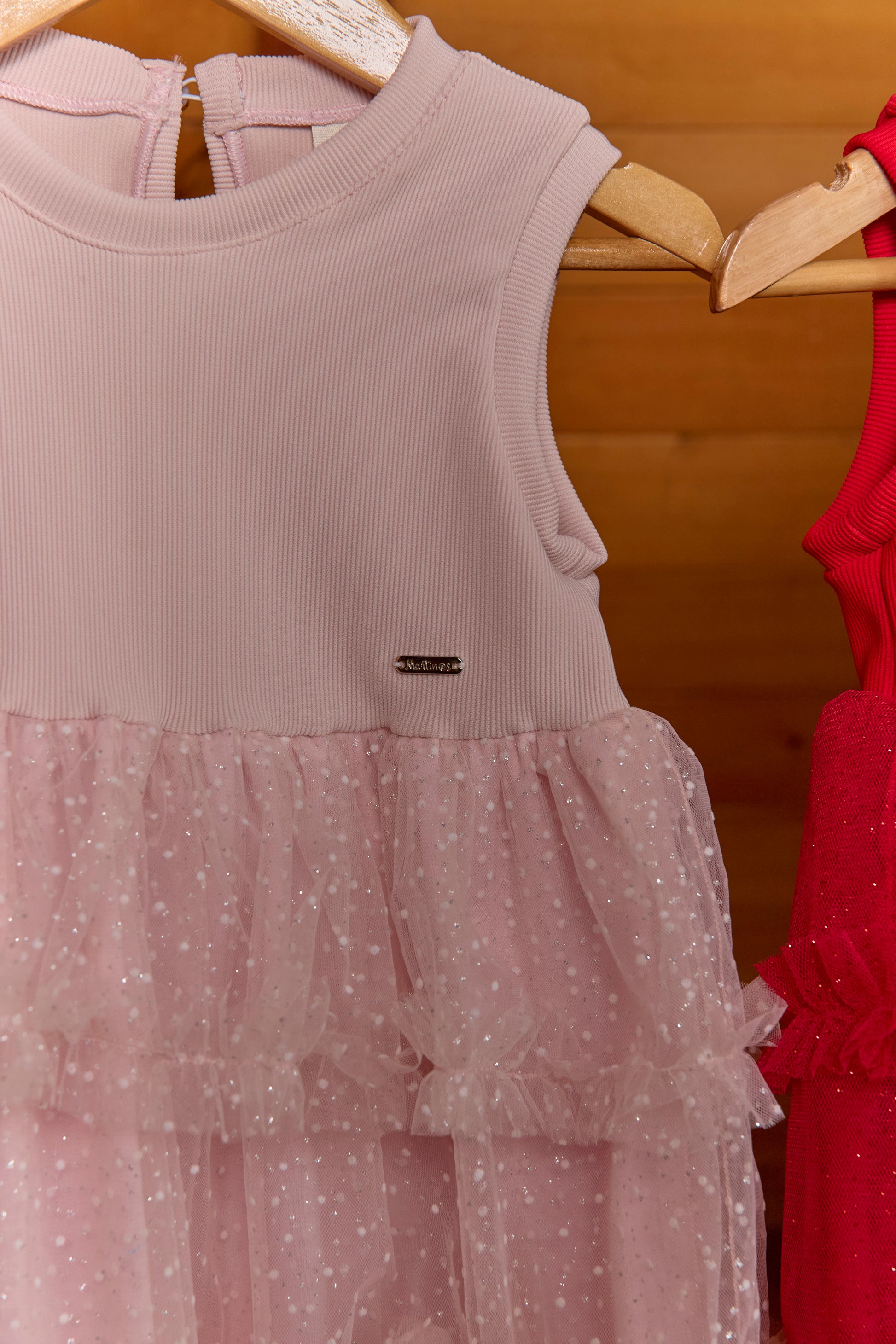 Vestido Rubí diseñado con ternura en tela rib suave que abraza cómodamente. Las delicadas golitas de tul con glitter crean un volumen romántico y etéreo, mientras que los destellos dispersos añaden un brillo sutil y cautivador. Ligero y versátil, es la opción ideal para que tu pequeña se sienta especial en cada ocasión, radiando elegancia y encanto con cada movimiento.